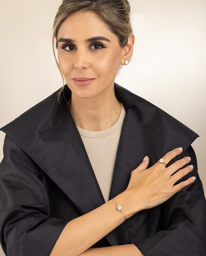 El mágico barrio Hipódromo Condesa fue el principal protagonista de esta colección. Las formas elípticas forman parte esencial de su arquitectura y planeación para esta pulsera con madre perla blanca.